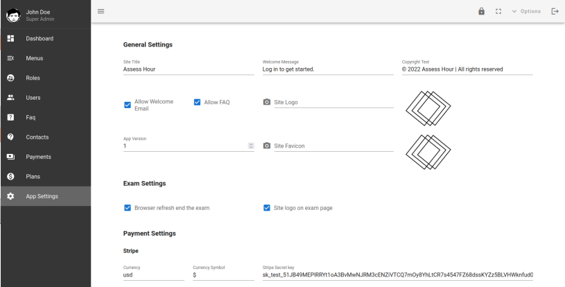 Total app settings including site logo, site favicon, site title, welcome message, copyright text, allow welcome email, allow FAQ, Exam Settings, Payment Settings, Email Settings & Color controls.