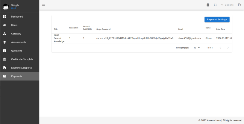 Here you can see all payments data of your paid assessments. Also you need to set your Stripe secret key to accept payments for paid assessment by clicking Payment Settings button on top right corner.